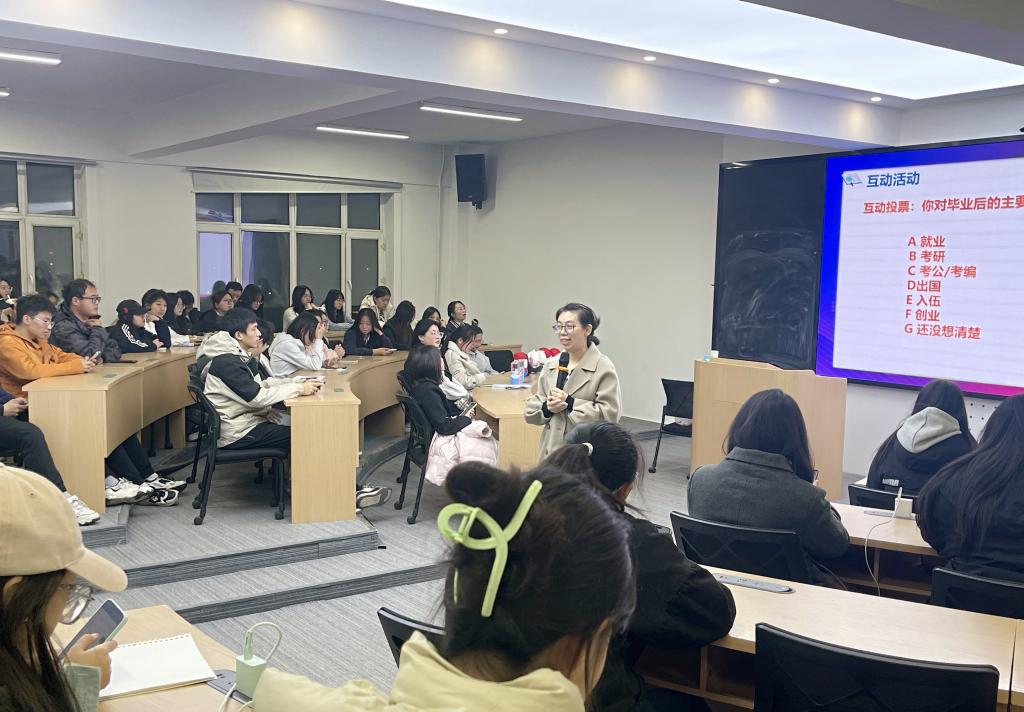 活动伊始,赵丽玲通过发起未来求职路径的互动投票,瞬间点燃了现场氛围。数据显示,在场同学对未来发展的选择呈现出多元化分布,就业、考公/考编、考研成为最受关注的选项,同时也有不少同学坦诚地选择了“还没想清楚”。这一真实的求职信息反馈凸显了举办本次活动的意义所在。