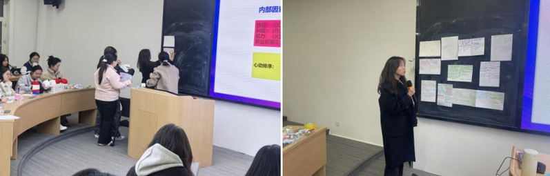 在“探索分享”环节中,同学们勇敢地将完成的画布贴在成果区,互相交流讨论。6名同学主动分享自己的画布成果,真诚地讲述内心的迷茫与期待。这些真实的心声引起了强烈共鸣,现场不时响起热烈的掌声。