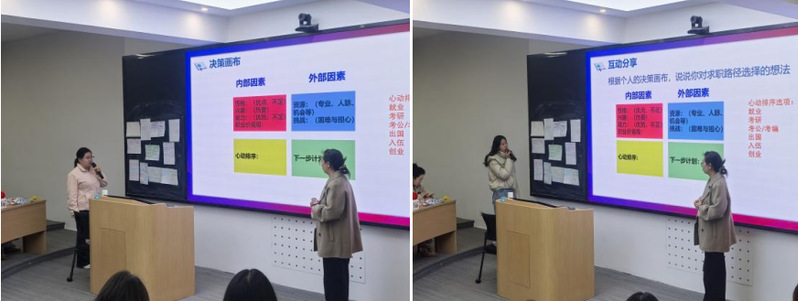 在“路径解密”环节,赵丽玲以其丰富的职业指导经验,为同学们系统剖析了就业、考研、出国、考公/考编、入伍、创业六大发展路径。现场互动气氛热烈,她不仅精准地指出了每条路径适合的学生特质,更客观分析了其中的核心价值与主要挑战,帮助同学们跳出“哪条路更好”的思维定式,转向“哪条路更适合我”的深度思考。