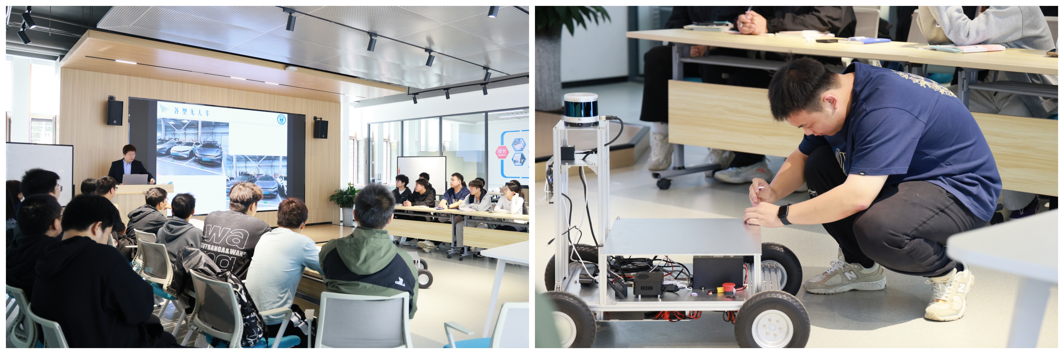 在无人车课程现场,刘勃博士以生动的语言拆解无人车的“感官与大脑”——感知、融合、系统架构与导航控制等关键技术逻辑。他将抽象理论融入真实应用场景,引导学生从“围观者”变为“技术玩家”。在互动环节,师生围绕“履带车设计”展开思维碰撞,从结构解析到场景拓展,再到优化路径,层层推进的探讨点燃了学生对特种车辆研发的热情,现场氛围活跃、掌声不断。