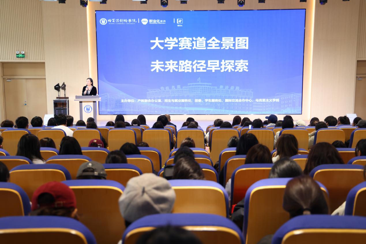 10月14日,我校正德楼报告厅内座无虚席,400余名同学踊跃参加本学期职业素养系列活动之“大学赛道全景图未来路径早探索”讲座。本次活动以就业为导向,由产教融合办公室统筹规划,联合招生与就业服务处、团委、学生服务处、国际交流合作中心、马克思主义学院多部门协同主办。依托各联办部门的专业资源与服务优势,围绕企业就业、入伍、考公考编、考研、出国等学生多元发展路径,为大一新生从政策解读、大学生活规划与校内支持三方面,系统式地呈现了一场内容充实、指引明确的规划盛宴。活动伊始,产教融合办公室总监刘晶作为主持人,系统介绍了我校职业素养项目的主旨与规划:以“职行π”作为活动品牌,针对不同年级学生的发展特点与需求,将持续开展多元化讲座、沙龙与实践项目,构建从“职业启蒙”到“技能提升”,再到“就业竞争力强化”的阶梯式培养模式,陪伴学生在每一成长阶段找准方向、积累能力。在正式的分享环节中,刘晶围绕“企业就业路径”主题展开深入解析。她指出,企业在招聘中尤为关注学生解决实际问题的能力、创造价值的潜力与综合职业素养,建议同学们在校期间积极参与项目实践、积累实战经验,主动提升岗位适配能力。同时,她介绍了学校为促进学生